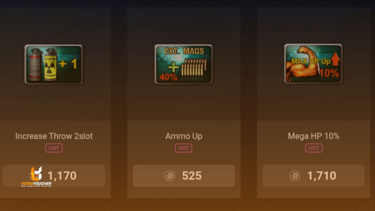 Kategori item fungsi contohnya quick change weapon, quick change magazine, quick reload, hollow point, increase grenade, increase throw, ammo up, mega HP, metal bullet proof, dan sebagainya.